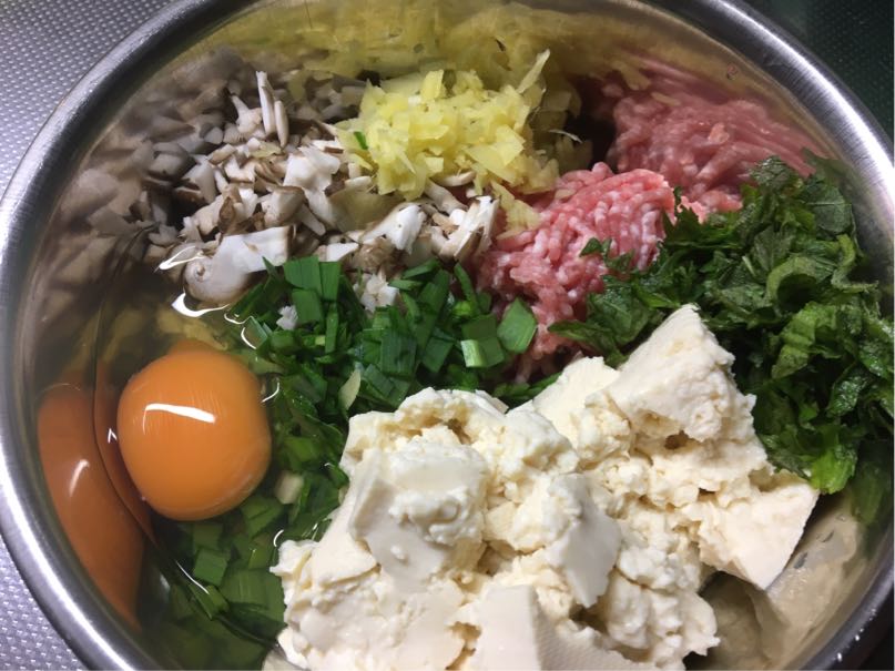 ひき肉、豆腐、しいたけ、ニラ、大葉、生姜、卵