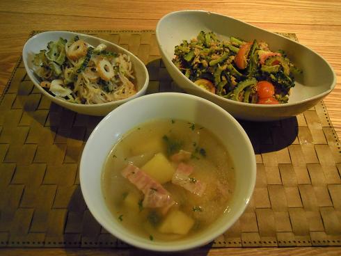 ゴーヤを使った料理2品と、パセリ入りの野菜スープでした。