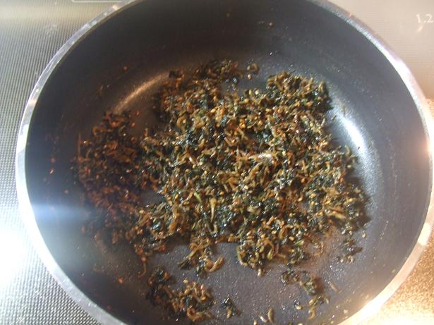 細かく刻んで~ しらすとごまと調味料を入れて炒めて~