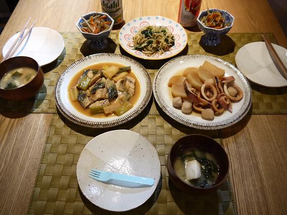 「サバの味噌煮」「大根とイカと里芋の煮もの」「もやしとほうれん草のナムル」「きんぴら」