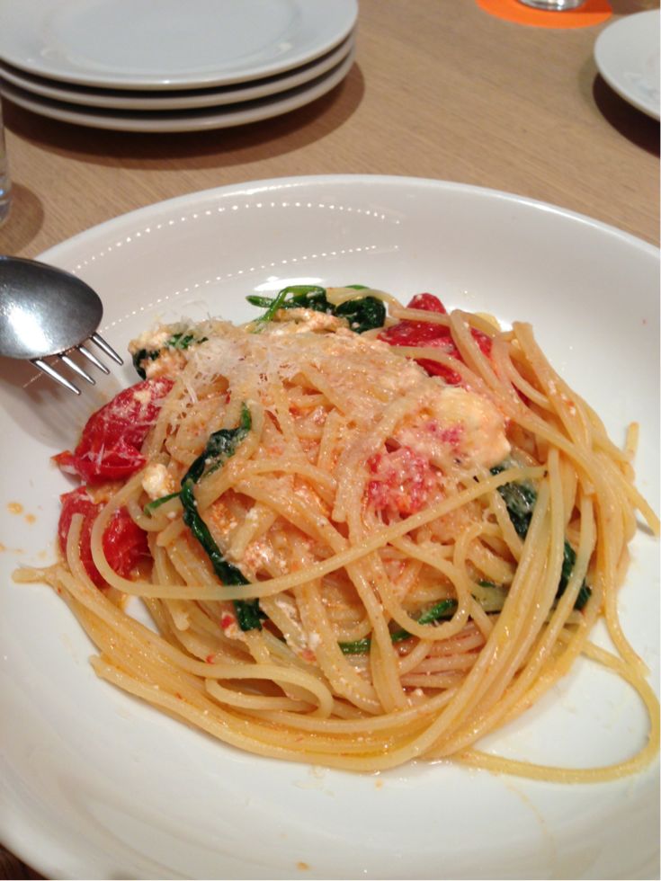 「チェリートマト、リコッタ、ほうれん草のスパゲッティ w/ ペコリーノチーズ 1300」