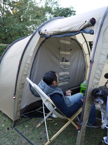風が強かった為、タープは張らずに、ペスサンク家のテントをリビングに使わせてもらいました。