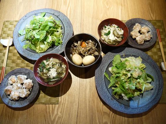 「サラダ」「海老シュウマイ」「まいたけとコンニャクと人参と牛蒡の煮もの」