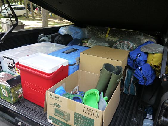 テントもタープも家に帰ってから干すんだし、と適当にクルクル丸めて車の荷台へ~。