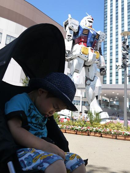 首がカクッとならないようにベビーカーの前車輪を持ち上げてくれてるpapaさん。
