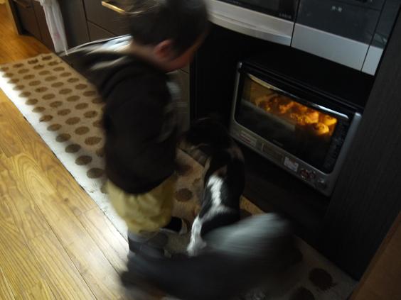 その後オーブンで17分焼いたら完成なのですが、待ちきれないウチの子達。(ブレブレ!笑)