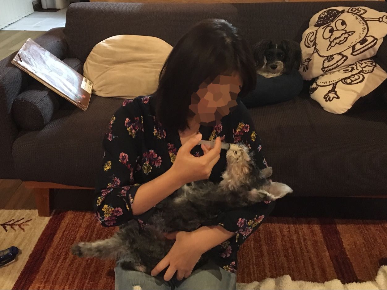 スポイトと注射器でフードと水を飲んでいるwasabi。