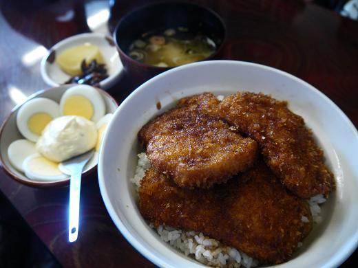 ゆで卵をもんじゃのヘラで好みの細かさに潰し、カツ丼の上へ~♪