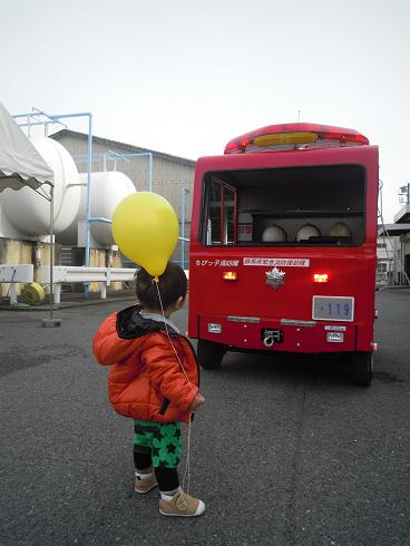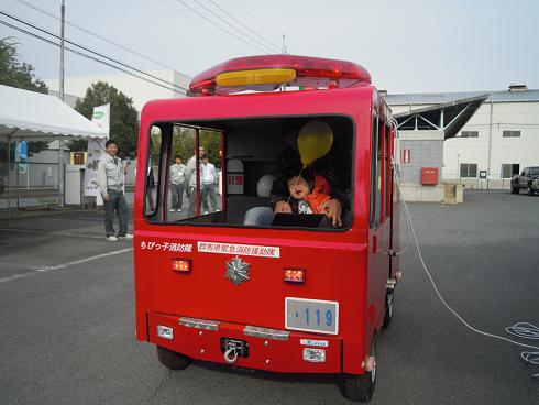 消防カートに乗せてもらっても泣く息子。