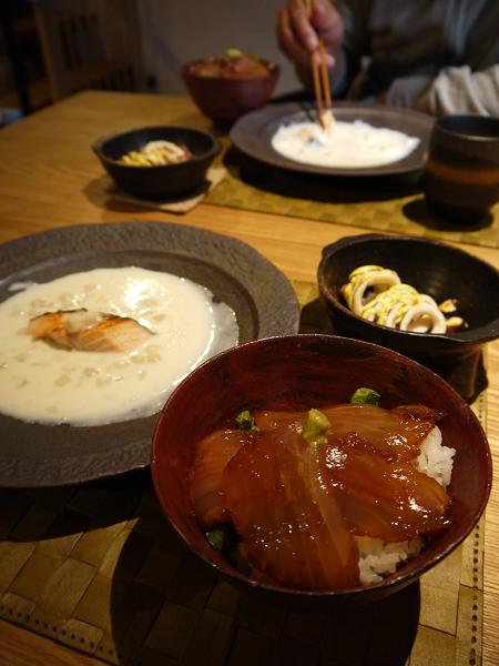 「漬けまぐろ丼」「サーモンのクリームシチュー」「イカ焼き」