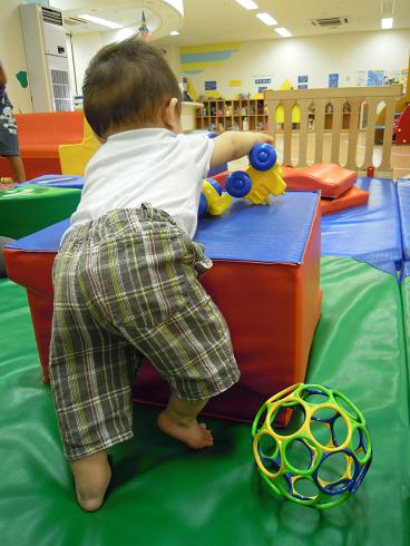 つかまり立ちで車のオモチャをいじったり・・・