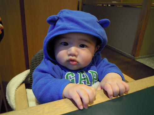 レストランなどに用意してある子供用の椅子に座れるようになった息子です。