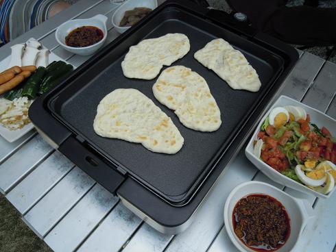 初めにホットプレートでナン(今日はチーズ入り)を焼いてから、