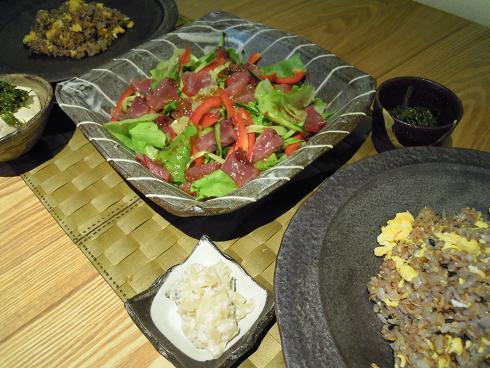 今朝水揚げされたカツオが手に入ったので、生でサラダに乗っけてみました。