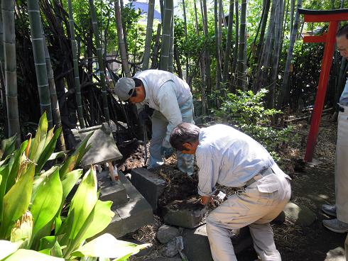 実家のお宮さんが、筍に押されて持ち上がってしまったんです。