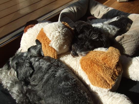昨日papaさんに買ってもらったぬいぐるみで遊び、疲れたようです。