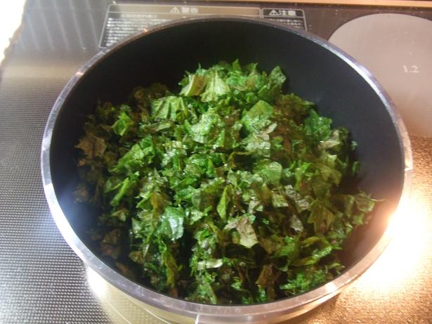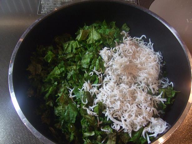 細かく刻んで~ しらすとごまと調味料を入れて炒めて~