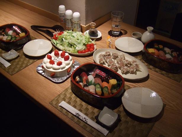 お寿司を出前してもらって、サラダと手作りシュウマイ、