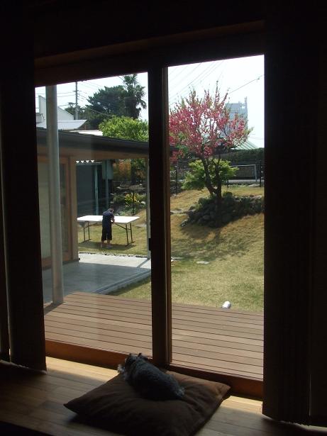 庭にテーブルを出して、絵を書いていました。