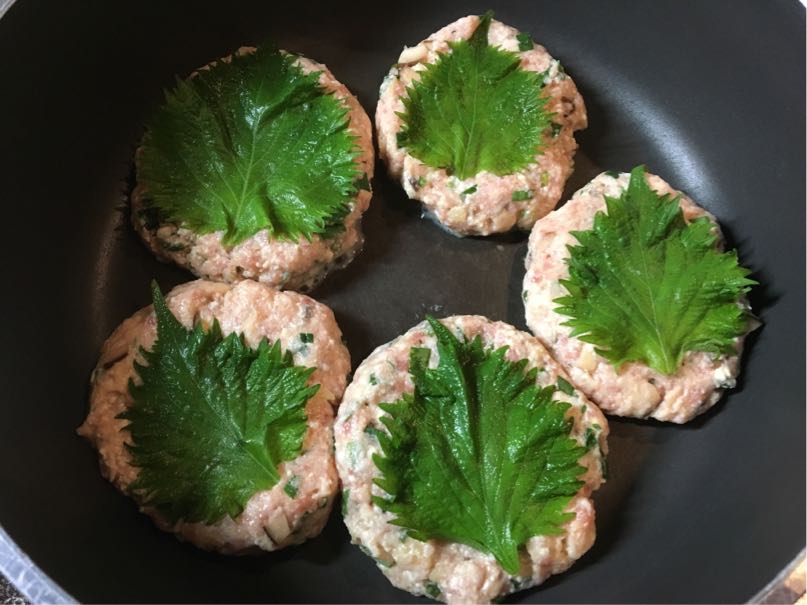 ひき肉、豆腐、しいたけ、ニラ、大葉、生姜、卵