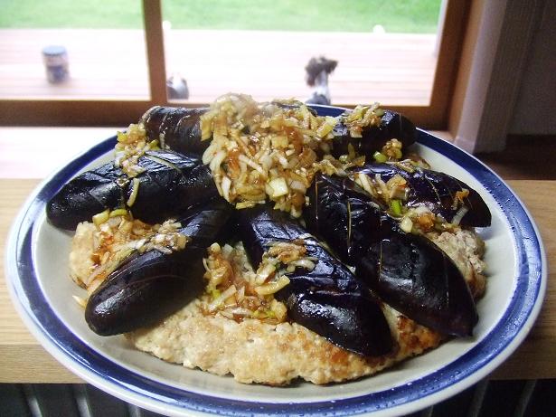 焼き茄子を上に乗せて、特製ねぎソースをかけて出来上がり~!