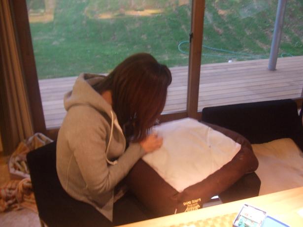 wasabi&uzullaが穴を開けたベッドをチクチク縫ってくれました。