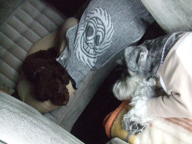 運転席と助手席の間で寝るwasabi・・・後部座席のサンクの方を向いてます。(笑)