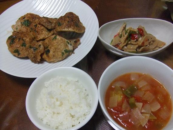「豚肉のしそゴマ照り焼き」「ピリ辛エリンギ黒胡椒風味」「野菜スープ」