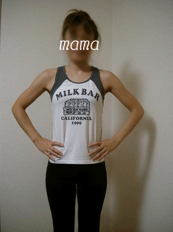 ということで今日は、タンクトップ3枚&黒のピッタリパンツ1枚を購入しました~♪♪mamaは「下はジャージで上はTシャツでいいんじゃない?」って思ってたんだけど、「そんなんじゃダメ!」と何故か買い物にノリノリのpapaさん。(笑)写真のタンクトップも前から見ると普通だけど、後ろから見ると丸~く穴があいてて、背中丸出しなんですよー!(下着はどうるすんだろね?笑)もしmamaが一人で買い物に行っていたら、絶対こんなの買わないな~~。だって初心者のくせに気合い入りまくってる人って恥ずかしいでしょ??(笑)でもpapaさんが「絶対こういうの着た方がいいよ!」って言うから・・・沢山試着してみました。果たして何着試着したんだろうね~~黒のパンツだけで4着は着てみたかな~~。でもたかが黒のパンツでも、履いてみると全然違うからビックリ~!!もちろん、mamaは足が一番キレイに見えるのを選びましたよ☆