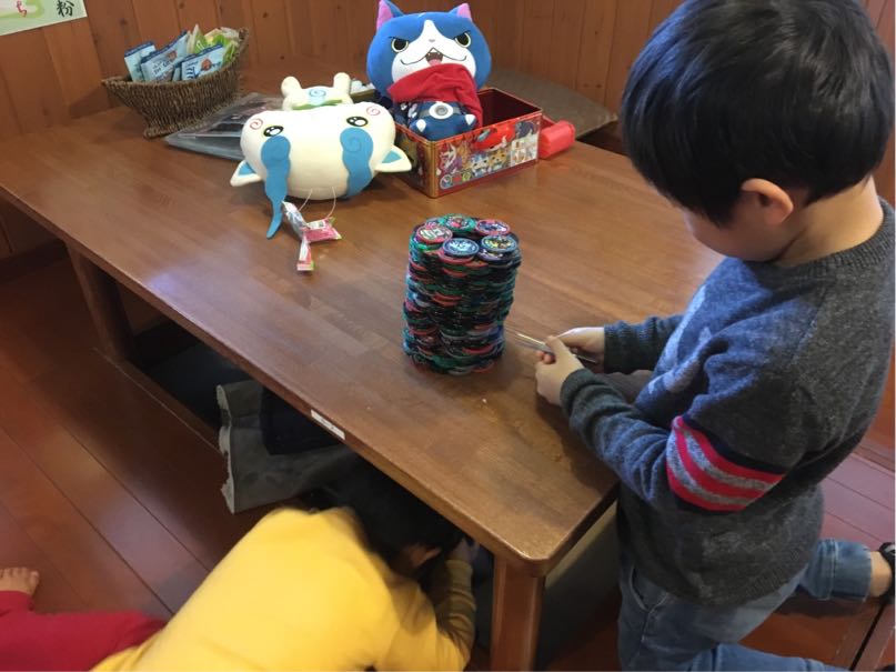 子供達は妖怪ウォッチのメダルを積み上げて、