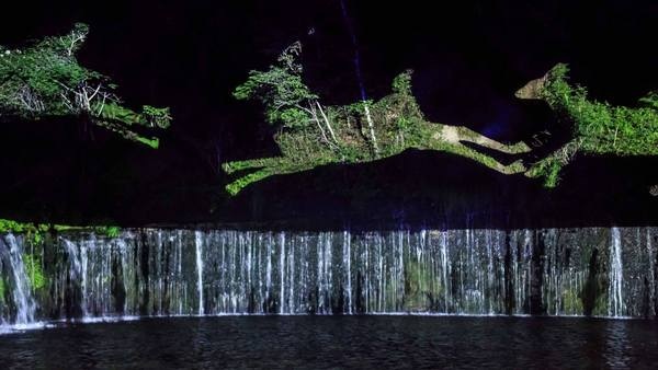 滝とその上の森の暗闇を使ってのプロジェクションマッピング♪