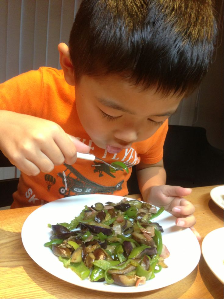 ピーマンとナスとベーコンの炒め物を独り占め!
