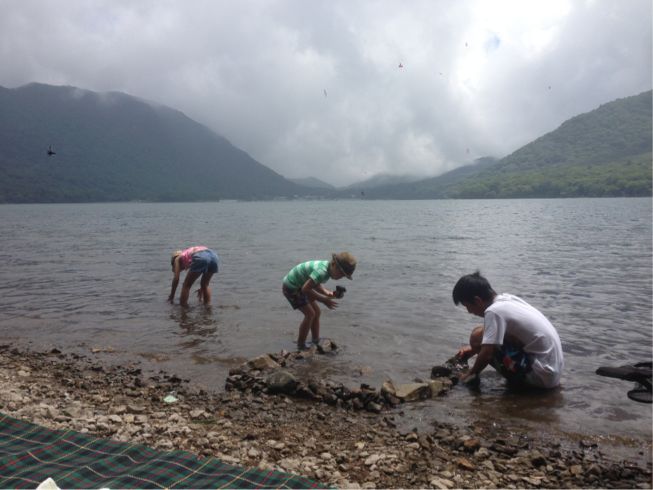 子供達は水に入って網で魚を10匹ほど捕まえてました。