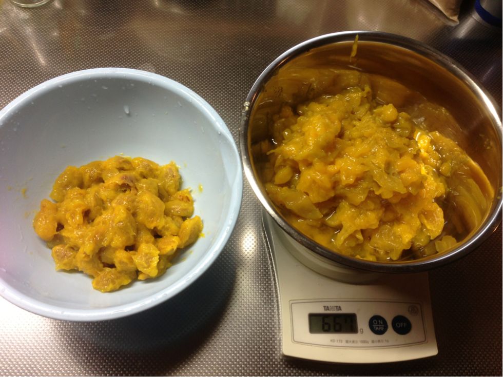 そして種を手で取り除き、果肉の量を量ります。