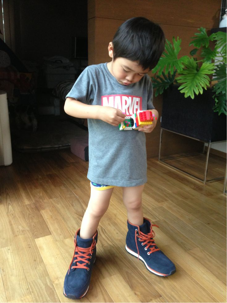 papaさんが買った靴を履いて、手にはLEGOのsheeta。