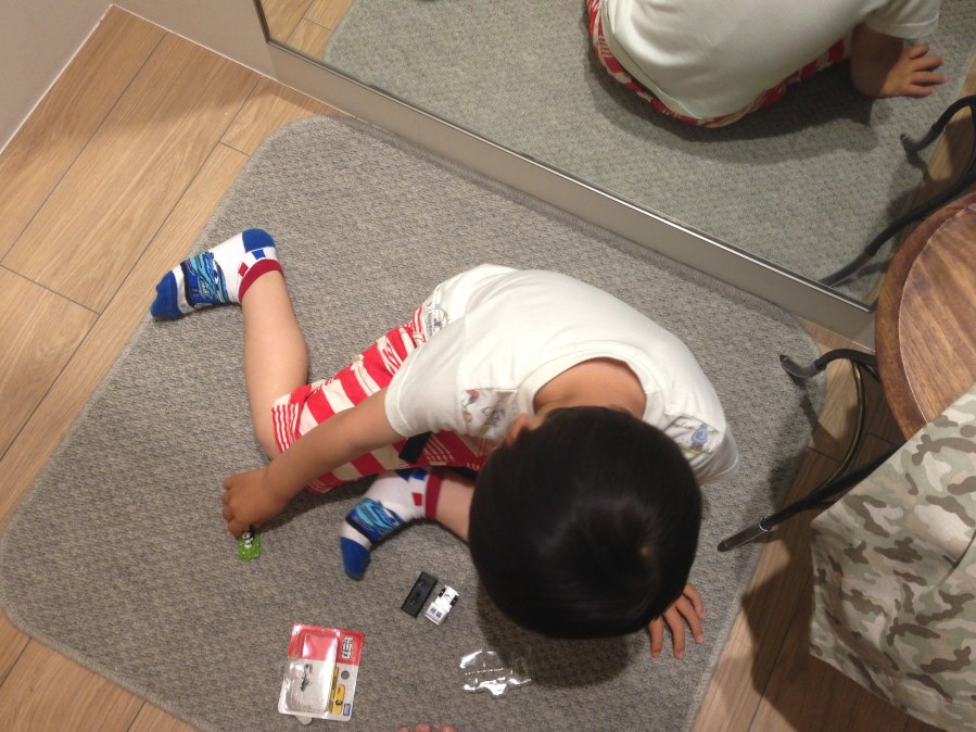 試着室に付いてきたsheetaは、買ったばかりのトミカで遊んでました。
