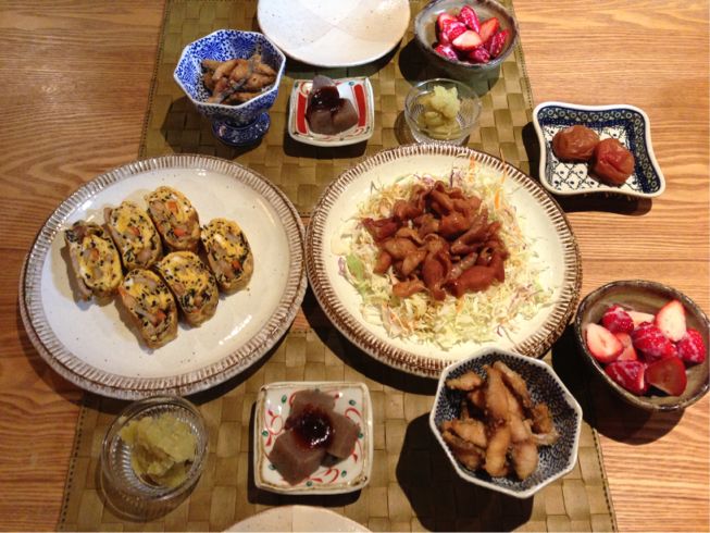 今日は「残り物のひじきを入れた卵焼き」「ホルモン焼き」