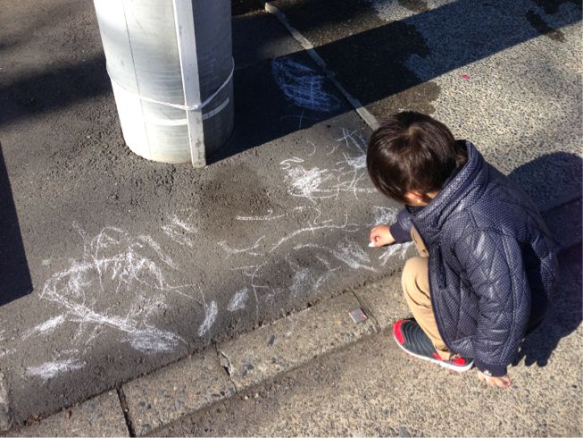 papaさんが洗車している横で地面にお絵かき!