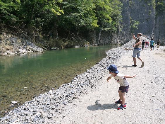 20分の休憩時間には川に石を投げて遊んでました。