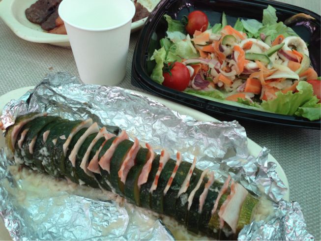 お肉の横でホイル焼きしたズッキーニ&ベーコン&チーズ、